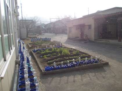 明るい朝陽に雪混じりの天候でした。1年生の花壇では,花菜が元気よく育っています。幸い,本格的な雪にならずにすみました。