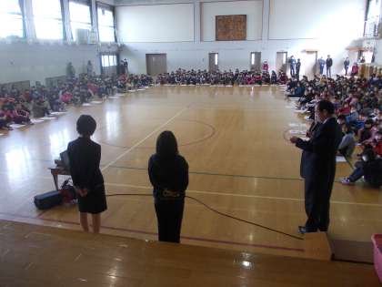 京都教師塾の学生さんが,現在修学院第二小学校で現場実習をされています。ほほえみ朝会を利用して,全校に紹介しました。
