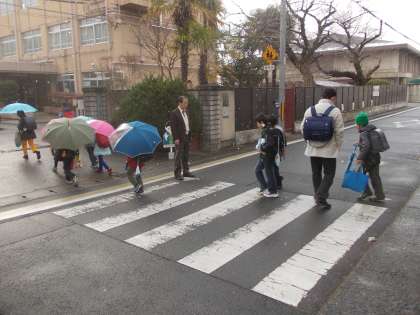 地域の皆様も登校指導していただいています。今日は町別で並んで登校できていました。