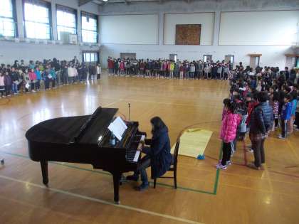 6年生を送る会を控えて,全校合唱曲『ビリーブ』の練習をしました。1年〜4年生が主旋律を,5・6年生が副旋律を歌います。発声練習をしてから,気をつけるポイントを教えてもらって練習しました。6年生を送る会が楽しみです。