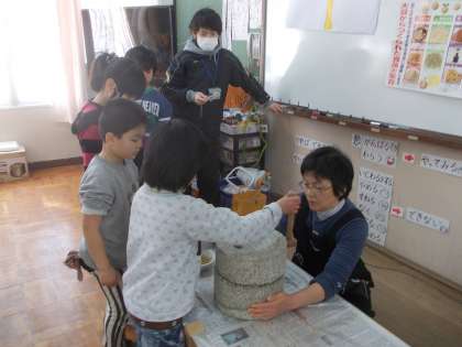 はにほ組では,炒った大豆を石臼で挽いてきなこにしました。得丸先生にお餅を作ってもらい,楽しい実習になりました。