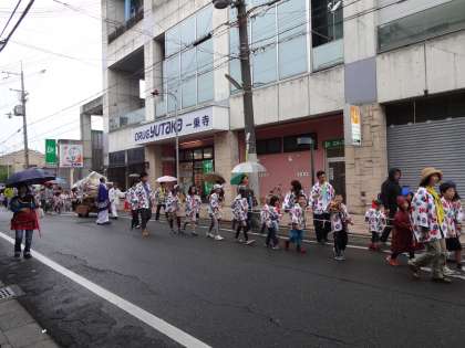 子ども神輿は,多くの子どもたちが雨の中を頑張って引っ張りました。