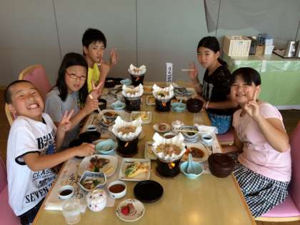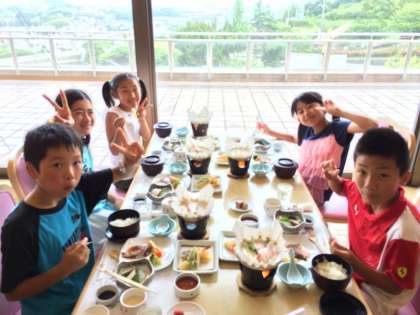 待ちに待った夕食です。豪華な食事に子どもたちはビックリ。美味しい美味しいと言いながら食べています。見晴らしのいいレストランで,楽しいひと時を過ごしています。
