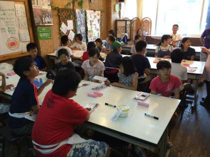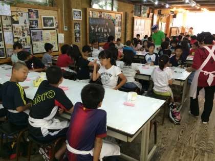 うどん学校に到着し、エプロンをつけました。いよいようどん打ちの始まりです。美味しく作れるかな?