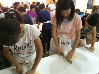 伸ばした生地を重ね合わせ、包丁で同じ幅に切りました。「同じ幅」というのが難しかったようです。