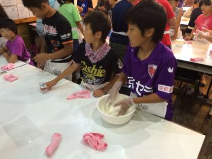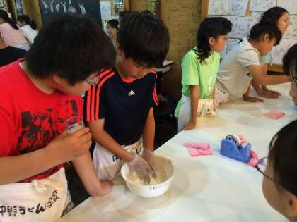 生地の作り方も教わりました。中力粉と塩水を混ぜ合わせます。なかなか粉っぽさがなくならず苦戦していました。