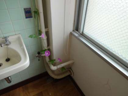 事務室に、校舎の外側に咲いているアサガオのつるが…。
