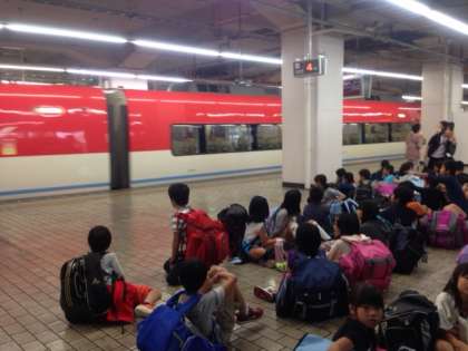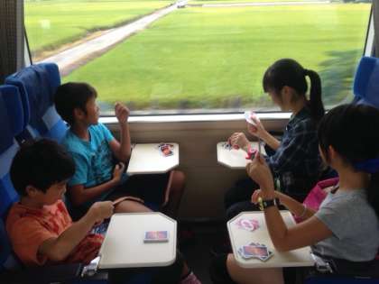 電車の中では,グループごとに楽しい時間を過ごしています。
