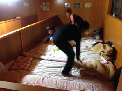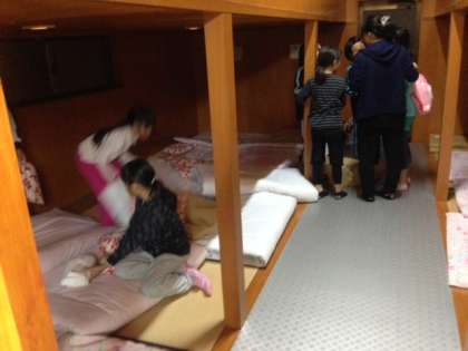 1日目はテント泊の予定でしたが,雨の心配があるためバンガローで寝ることになりました。寝る前に,寝具準備をしています。