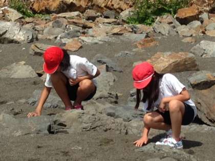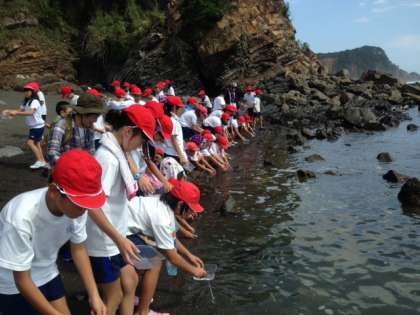 宮崎浜で,磯観察をしました。明日行く志摩マリンランドの職員の方に来ていただき,磯の生き物について教えていただきました。一人ずつヒトデの観察をしました。