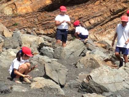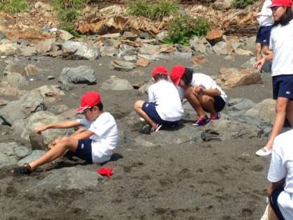 宮崎浜で,磯観察をしました。明日行く志摩マリンランドの職員の方に来ていただき,磯の生き物について教えていただきました。一人ずつヒトデの観察をしました。