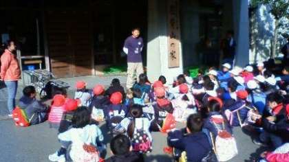 本館前で、案内をしてくださった山の家の先生のお話を聞き、お礼を言っています。