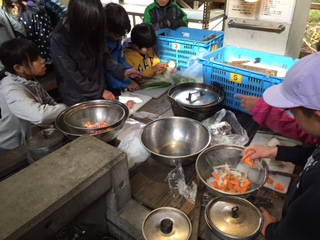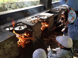自分たちでおこした火を使って,2回目の野外炊事をします。