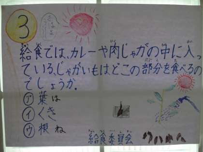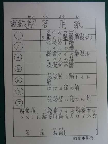 26日からの給食週間に先だって、給食委員会が「給食クイズラリー」を企画してくれました。校内各所にクイズの紙を掲示しています。