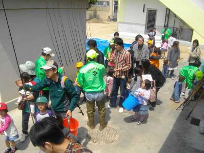 道具を受け取りプールに向かいます。釣れるといいなぁ…。