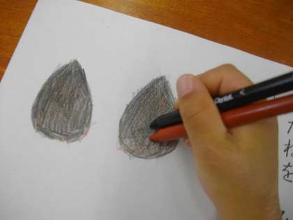 連休が終わり,いよいよアサガオを育てます。植えてしまったらタネの観察ができませんので,まずタネの観察です。一色ではタネの色を表現できないので,なかなか苦労して色をだしていました。