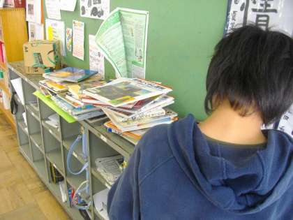 図書館学校団体貸出を利用して,教室にたくさんの参考図書を集めて学習しています。授業時間だけ出なく,運動場が使えない中間休みにも有効に利用しています。