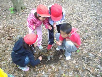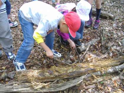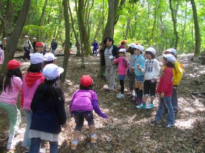 社会科の学習をしお弁当を食べた後,風が強かったので,森の中まで戻って遊びました。石をさがしたり,虫をさがしたり,だるまさんが転んだをしたり…。おやつを食べながら楽しいひと時を過ごしました。