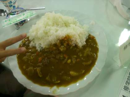 淡路島牧場に着きました。まずは昼食。淡路島牧場特製のミルクビーフカレーです。普通で大盛り。大盛りを頼んだ人はジャンボサイズでびっくり。