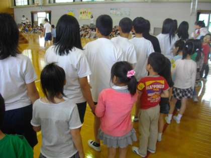 いよいよ1年生を迎える会が始まります。1年生は6年生に手を引いてもらって入場し,階段の上で名前を呼んでもらい,大きな声で返事をして席に向かいます。1年生と6年生が並ぶと,小学校生活の5年間の成長が実感できました。