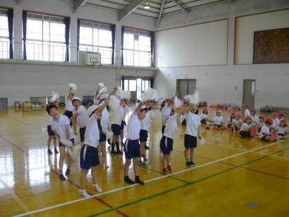 競技の3年生ですが,入場後に声を合わせて踊る場面があるのです。各色の対抗意識が盛り上がり,体育館に子ども達の声が響いていました。