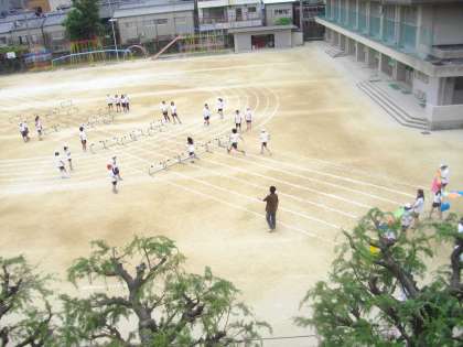 6年生のハードル走は,小学校最後の運動会の種目の一つです。自分の歩幅に合わせてハードルのインターバルを選んで練習しています。色画用紙で合図して,係の児童にインターバルを調整してもらいます。