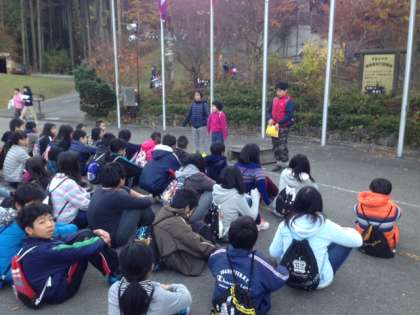 山の家での野外活動体験も4日目をむかえました。朝の集い。朝食。みんな元気です。