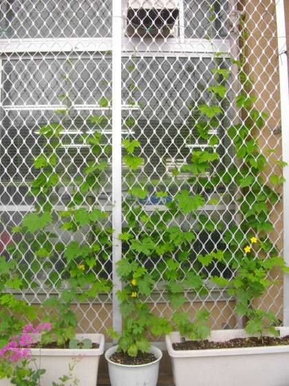 防球ネットにしがみつき,花も咲き始めました。