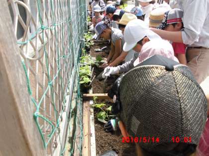 5月14日(土)修二小教育後援会主催の「ゴーヤの苗付けとかんばん作り」が実施されました。30名の子どもたちが参加し,植え付けの前に「ウリ科」植物を見つける学習の後,ゴーヤ,へちま,ひょうたんから一つの苗を選んで植えました。しっかり世話をして,立派なみどりのカーテンができるといいなと思います。