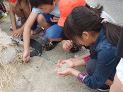 粒のそろったさらさらの砂を使って水の汚れを取り除いていくことを教えてもらいました。