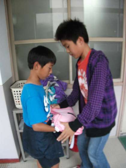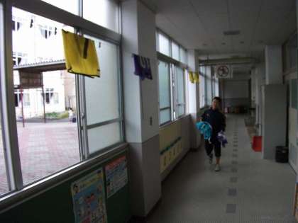 自転車交通安全教室で使ったビブスを洗濯しました。廊下に干してあったものの取り入れは,6年生が手伝ってくれました。