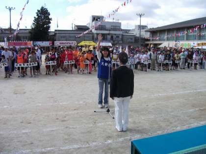 区民運動会の入場行進はドリームバンドが担当し,町内のプラカードは小学生が持って行進しました。選手宣誓は,6年生児童がしっかり宣誓しました。