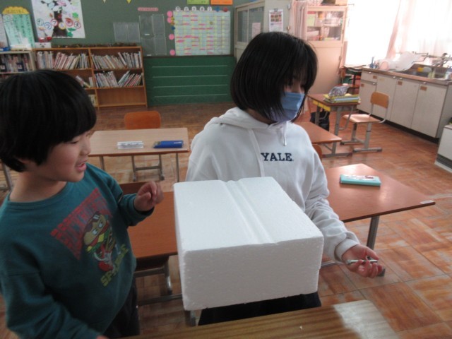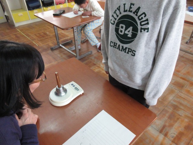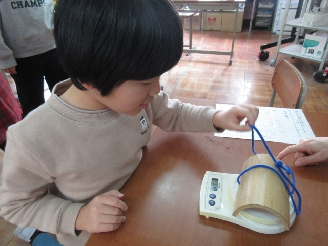 算数では、重さの勉強をしています。今回は、プラスチックである「発泡スチロール」と金属である「ねじ」はどちらの方が重いのか考えました。実際に持ってみたりしながら予想をたて、みんなで一緒に意見を出し合うことができました。また、後半では教室の中を動き回り、様々な物を計る活動もしました。色々な物を持ってくる中で、これは思ったより軽いんだ!これは〇〇グラムだと思う!など、楽しく予想し考えて活動することができました。