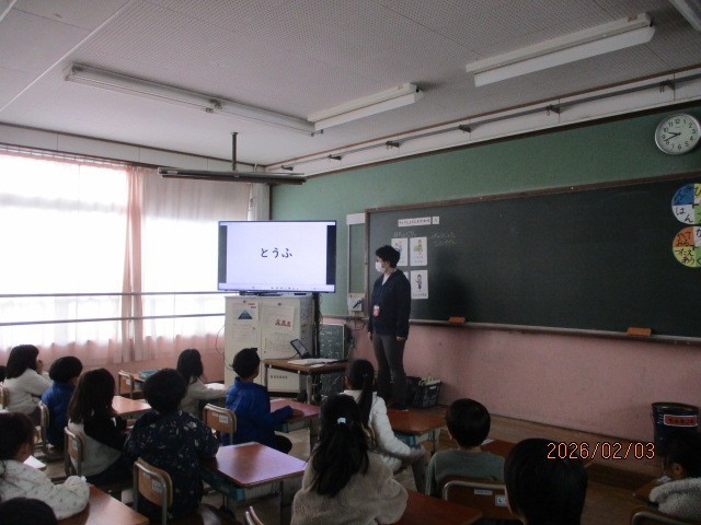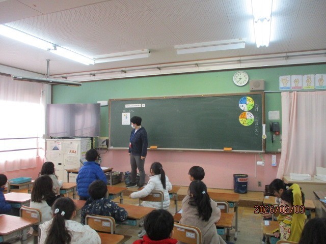 「ありがとうの気持ちで食べよう」というテーマで、栄養教諭と食の学習を行いました。「給食を食べるまでにどんな人が関わっている?」という問いかけでは、「給食調理員さん」「野菜を育てる人」「牛乳を運ぶ人」など様々な人を挙げていました。給食の材料が学校に届くまでの映像を視聴した際には、「こんなにたくさん!」「運ぶのが大変そう」などの声が聞こえてきました。学習の最後には、「ありがとうの気持ちで食べるために自分が頑張ること」を考えました。頑張ることとして「残さず食べる」「苦手な物も少しは食べる」「いただきますの挨拶をする」などが挙がり、本日の給食から実践している子どもたちの姿が見られました。
