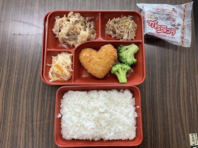 バレンタインメニューということでハートの形をしたカレーコロッケや米粉のガトーショコラが登場しています。