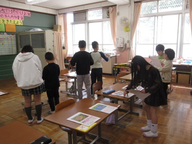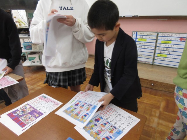 今年もに組カレンダーを色々な教職員の方や各学年に配りに行くために、に組のみんなでカレンダーを丁合し、ホッチキスでとめる活動を行いました。落とさないように、バラバラにならないように緊張しながらも、誰一人列を崩すことなく、一人一人が真剣に一枚一枚丁寧に重ねて、上手にホッチキスでとめることができました。これから、自己紹介とともに、に組カレンダーを配りに行きたいと思います。
