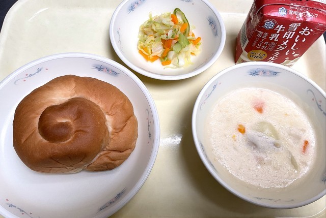 いつものコッペパンと違う形のバターうずまきパン。パターの香りがよく、クリームシチューとよく合いました。