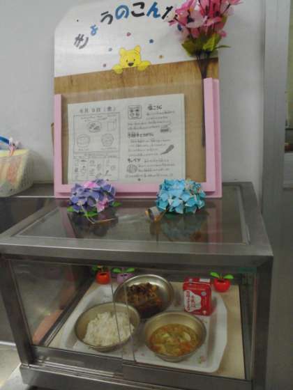 げんまいごはん 牛乳 さわらの塩こうじあげ 万願寺とうがらしのおかかに キャベツのすましじる