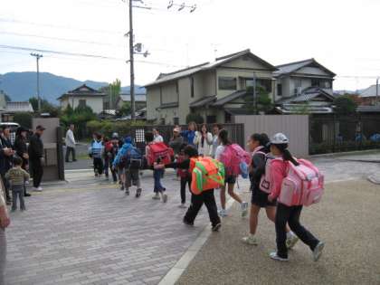 7時50分予定通り「出発式」を行い,8時みさきの家に向けて,たくさんの荷物を背負い53名が元気に出発しました。
