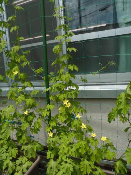 風船カズラ、ルコウソウ、ゴーヤ、いろいろな植物を校舎を這い登らせます。