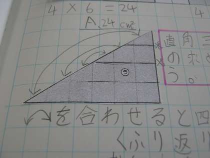 今日は,これまでの学習をいかして,直角三角形の面積の求め方を考えました。