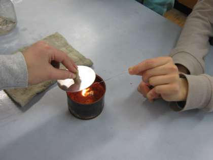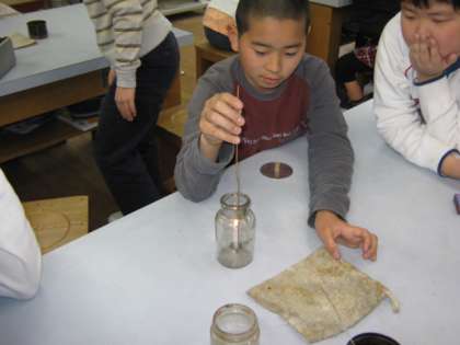 集気ビンの中のろうそくの火を観察すると,だんだん炎が小さくなり,やがて消えることが分かりました。