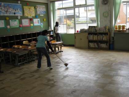 6年生が1年生の教室を掃除しています。