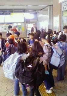 賢島駅に到着しました。みんな、とっても元気です。雨も降っていないのでラッキーです。