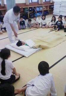 90畳の部屋で,所員の方からお布団のひきかたを教えていただきました