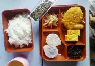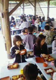 あずまやで食事をしています。スポーツを楽しんだ後なので皆は大喜びです。11時頃からぱらつき出した雨も今はやんでいます。