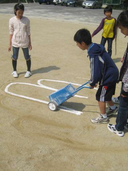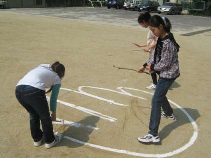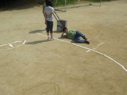 運動場が広いので,意外と小さい?と感じた子どもたちもいましたが,書かれた大きな耳の上に思わず寝転がってしまう人も現れました。
