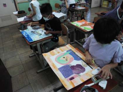 下絵でお話の世界を膨らませ,色塗りに熱中しています。自分らしい作品がどんどん出来上がってきています。全員が描き終えたら,お互いの良いところを見つける鑑賞を行います。