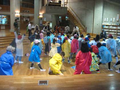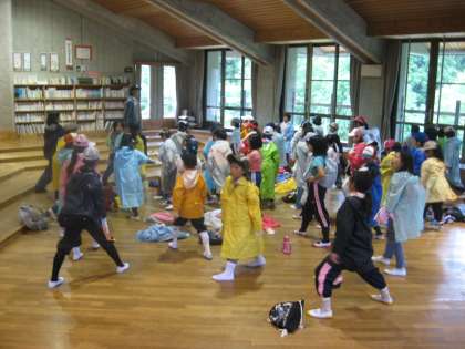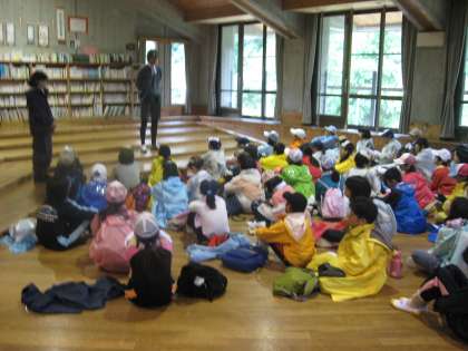 引率指導していただく花背山の家の先生からお話をいただいたあと,準備運動。そして,出発です。