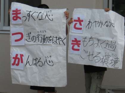 児童集会では,児童会のスローガンが計画委員から発表されました。